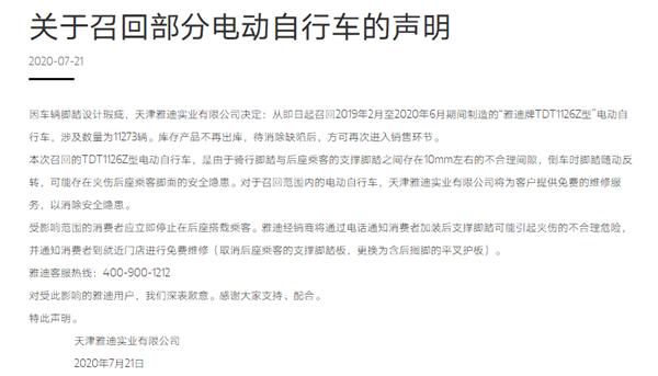 天津雅迪实业有限公司已在官方网站发布召回计划,提示持有受影响产品的消费者停止在后座搭载乘客。
