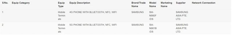 根据外媒 91Mobile 的截图,本次现身印尼 IMDA 机构的设备型号和此前现身 NBTC 的相同,4G 版本型号为“SM-980F/ DS”,5G 版本型号为“SM-N981B/ DS”。其中“DS”代表的意思是双卡双待。