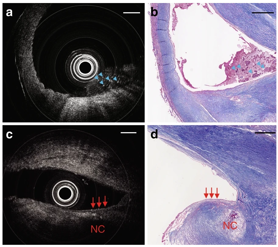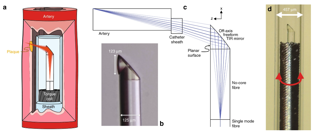 有了这一突破,该团队打造了一个小到可以推开人体血管的OCT扫描设备。 这种超薄的探头可以旋转并慢慢向后拉,以建立周围环境的3D地图,深度约为表面下半毫米。 它提供了前所未有的能力来扫描人体血管系统,寻找由脂肪、胆固醇和其他物质组成的斑块,这些斑块容易在血管壁上堆积并导致心脏病。