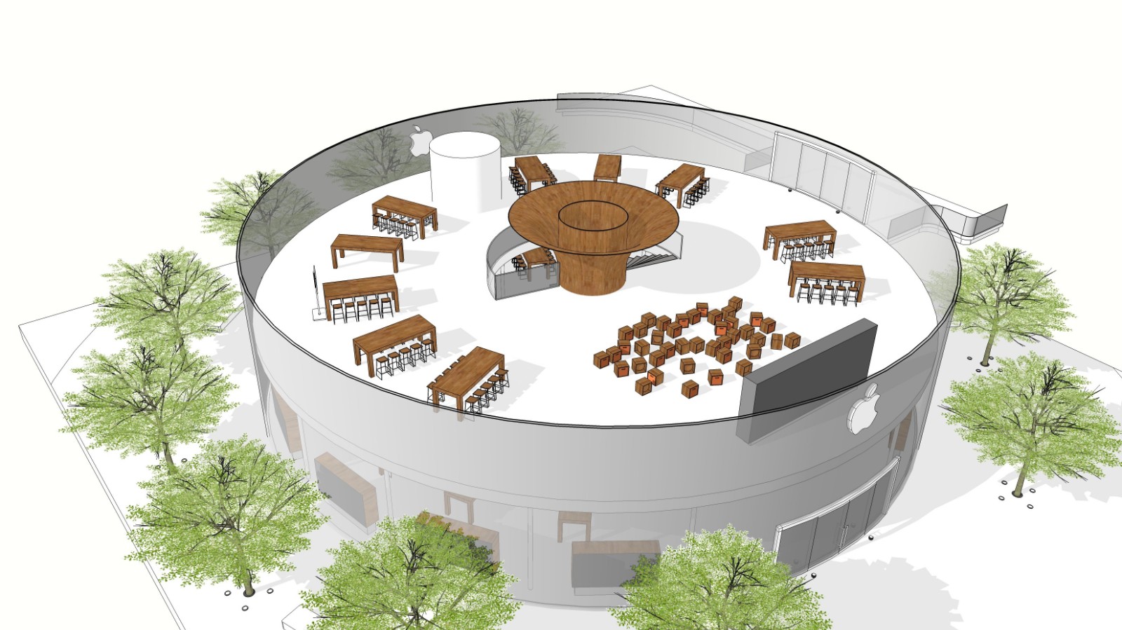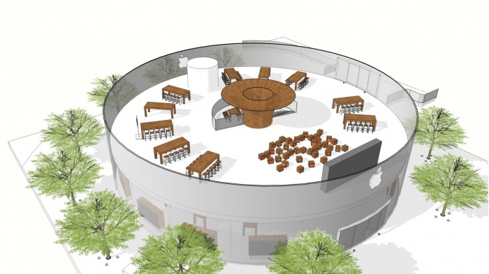 泄露的建筑规划图显示,该店将以木质桌子为特色,以环形排列在店内地板周围,沿墙设有用于展示产品的货架。商店的中心有一个蜿蜒的楼梯上到二楼,那里有一个论坛区,有一个大的视频屏幕和Today at Apple会议的桌子。