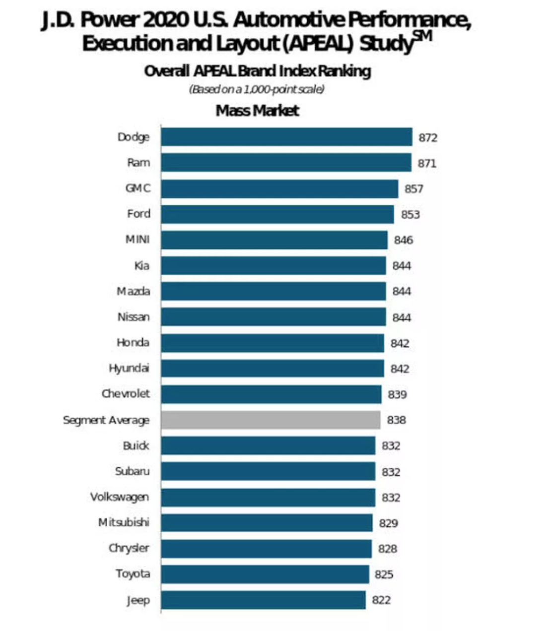 在大众市场品牌中,道奇以872分的成绩排在第一位。J.D. Power指出,道奇不仅在APEAL研究中排名第一,但新车品质榜单中也位居榜首。这是美国第一个做到这两点的汽车品牌。