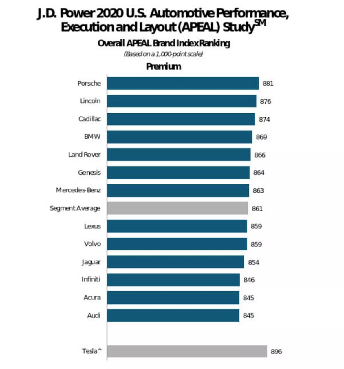 由于大家在了解特斯拉新车品质研究结果时是半官方的,所以这个品牌在这里也应该得到同样的对待。在1000分的评分中,特斯拉得分高达896分,领先于真正的领先者保时捷881分。与此同时,这家电动汽车制造商的得分也远高于豪华车行业的平均得分861分。