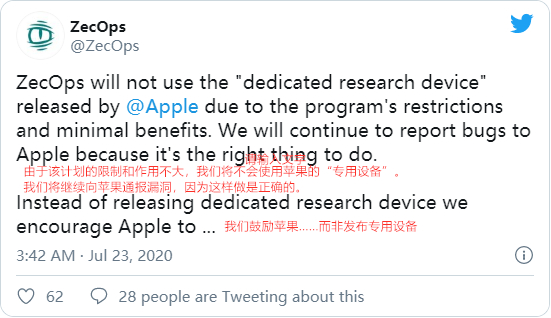 网络安全厂商ZecOps也在Twitter上宣布将不参与SRD计划,继续以传统方法研究iPhone安全问题。