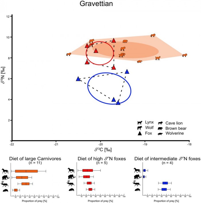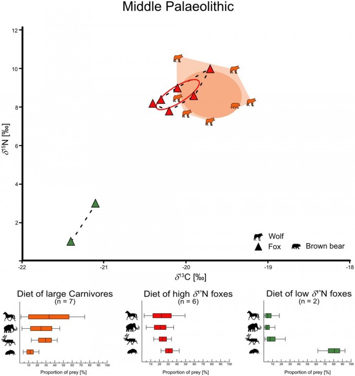 图宾根大学森肯贝格人类进化和古环境中心的科学家,在施瓦本汝拉地区的几个洞穴中挖掘出来了几根狐狸骨头,距今有 4.2 万至 3.2 万年之间。科学团队分析多种植食动物、大型肉食动物以及红狐和北极狐的残骸,比较碳和氮同位素含量,得出上述结论。