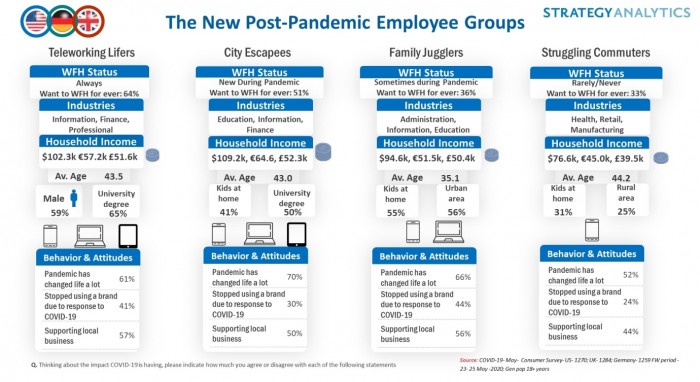 Strategy Analytics最新发布的研究报告指出,大量员工的在家办公将减少数十亿的通勤路程,并使基于办公室的工作环境减少22%。该分析基于后疫情时代就业环境中四个雇员群体的出现:逃离城市人群占24%:他们热爱在家办公(WFH),其中一半的人想要永远在家工作。家庭照顾人群占30%,他们并不太喜欢在家办公。