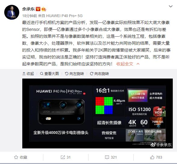 尽管三星、小米等均上马了高达一亿像素的摄像头,可从DxOmark的榜单成绩来看,这些手机在影像方面依然小输华为,而后者坚持的是大底、大单像素尺寸的CMOS方案。对此,华为消费者业务CEO余承东今天下午(7月23日)再次微博发声,他表示“最近进行手机相机方案的产品分析,发现一亿像素实际拍照效果不如大底大像素的Sensor,即便一亿像素通过多个小像素合成大像素,效果也还是有折扣与差距。”