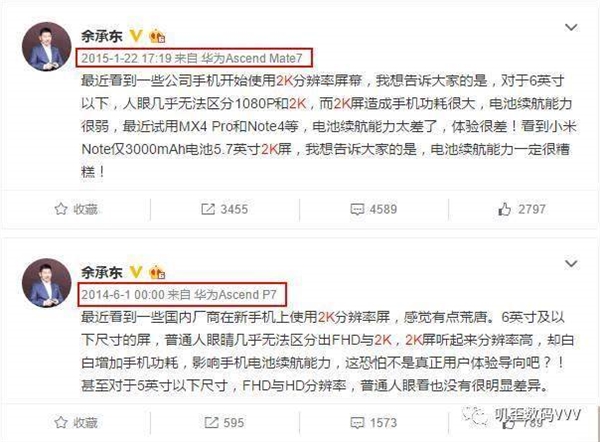 关于之前的2K屏言论发表于2014年和2015年,当时余承东的观点是,6寸以下屏幕肉眼无法区分2K和FHD,而前者会徒增功耗影响手机续航能力,他认为这不是用户体验导向,友商的魅族MX4 Pro、三星Note4、小米Note等都是糟糕的存在。