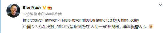 7月23日消息,今天马斯克在微博表示,“中国今天成功发射了首次火星探测任务“天问一号”探测器,非常振奋人心。”而在推特上,他称,"Impressive Tianwen-1 Mars rover mission launched by China today."与微博内容相同。
