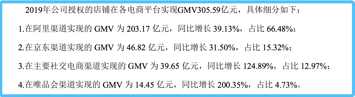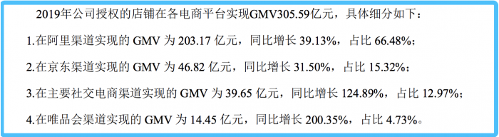 2019年,其以家庭为场景,南极电商在阿里、京东、社交电商、唯品会等各电商渠道合计约有10万个产品链接。公司在各电商渠道可统计的GMV达305.59亿元,同比增长48.92%。其中南极人品牌GMV为271.38亿元,占公司整体GMV的88.9%,同比增长52.86%。