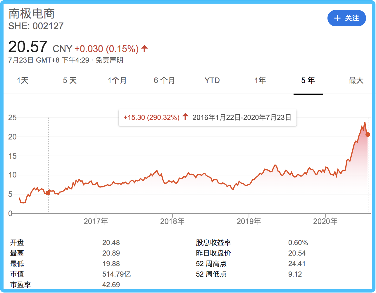 2016年1月成功上市至今,南极电商股价累计涨超290%,市值已经翻了近三倍。特别今年以来,南极电商股价累计上涨了70%,市值近515亿元。