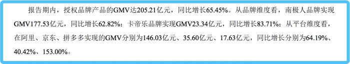 2019年,上海兰魅向南极电商缴纳品牌服务费为2210万元,以2019年品牌费率(品牌服务费收入/GMV)4.57%推算,这家公司线上GMV应达到4.8亿元;但该公司披露的2019年营收仅为1.77亿元。