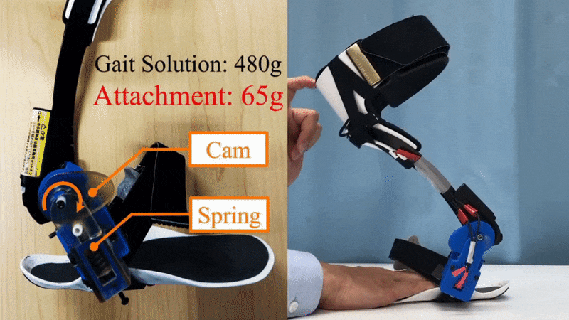 在佩戴好该工具之后,伴随着受影响腿部的脚踝运动,会使装置中的一个椭圆状的凸轮对着一个集成的螺旋弹簧滚动,使其压缩。一旦他们开始将重量从那条腿上移开,进行前行,那根弹簧就会被释放,将他们的脚后跟推上去,从而使他们的膝盖弯曲。