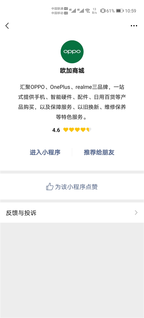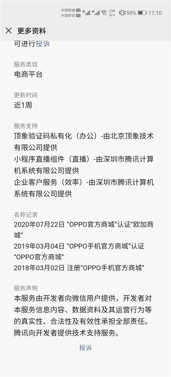 从微信小程序提供的资料来看,欧加商城为“东莞市永盛通信科技有限公司”开发,更进一步查询,确认其为“OPPO手机官方商城”更名而来: