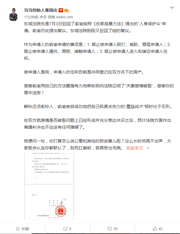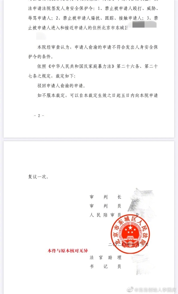 7月24日消息,李国庆微博称俞渝近期按照《反家庭暴力法》提出“人身保护令”申请,这一申请被东城法院驳回。俞渝申请的事项包括:1、禁止被申请人殴打、威胁、辱骂申请人;2、禁止被申请人骚扰、跟踪、接触申请人;3、禁止被申请人进入和接近申请人住所。值得注意的是,被申请人为李国庆,申请人的住所目前是共同登记在双方名下的房产。