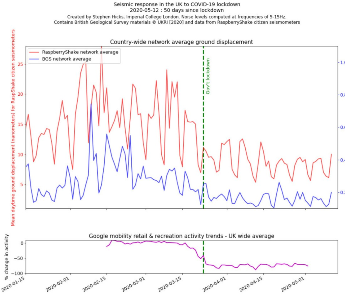 这些震动由地震仪测量获取,科学家们通过观察从世界各地的观测站获取的数据可以追踪人为产生的地震噪音的下降。这种情况以前在圣诞节和新年等假期曾出现过,但新的分析表明,新冠肺炎的封锁将这一情况提升到了一个全新的水平。