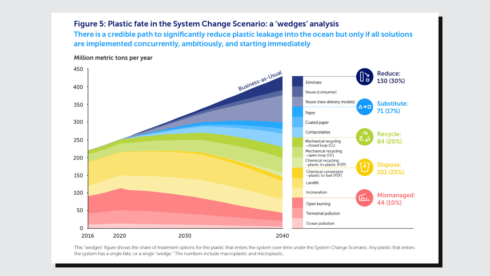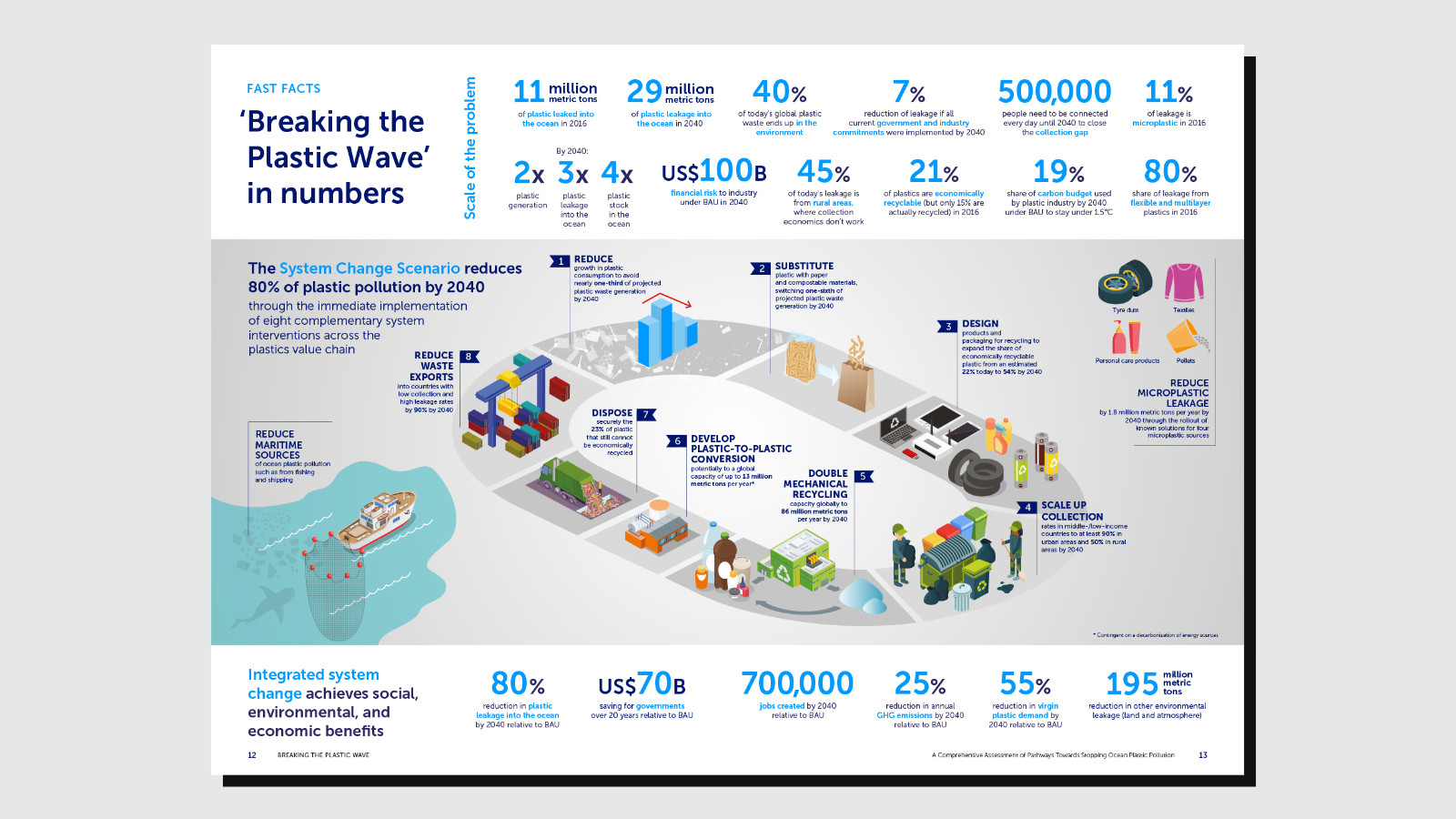 报告发现,目前已经有技术解决方案可以在2040年将塑料污染减少80%,如果没有任何改变的话。这些改变在经济和政治上都是可行的,但它们必须现在就开始。