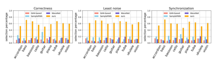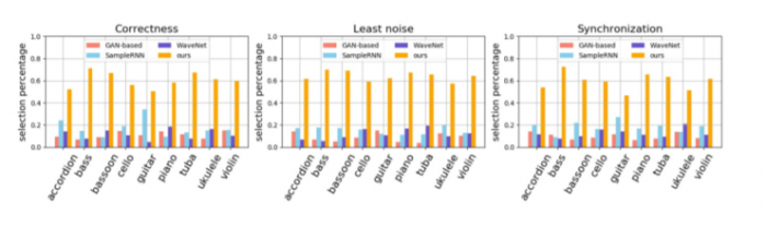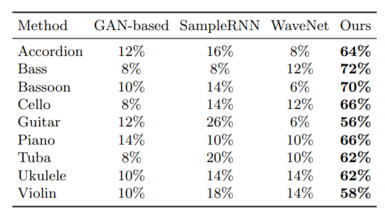 研究人员证实Foley Music远优于现有其他模型。在对比试验中,他们采用了三种数据集对Foley Music进行了训练,并选择了9中乐器,与其它GAN-based、SampleRNN和WaveNet三种模型进行了对比评估。