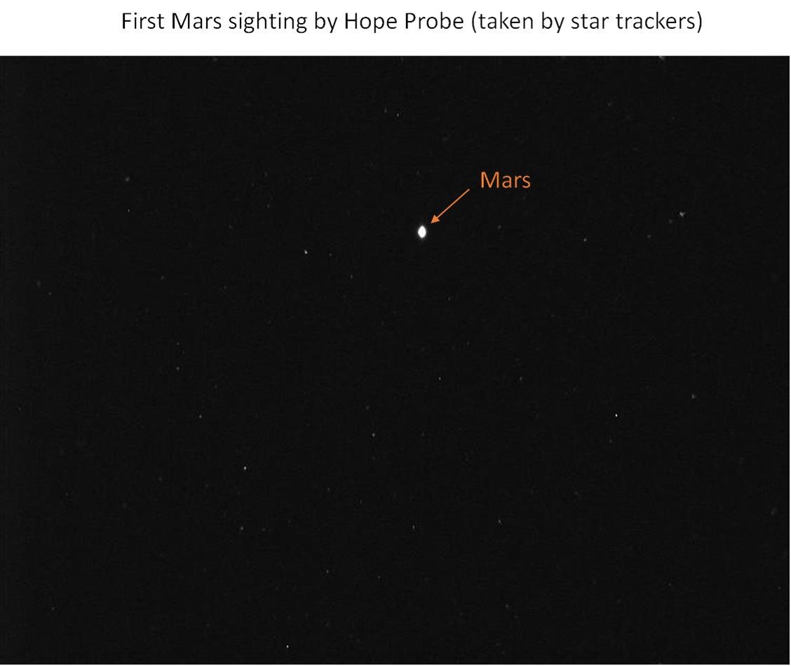 阿联酋“希望号”探测器在7月20日发射后首次将一张从地球附近远望火星的照片传回了地球,拍摄时它已在太空中飞行了100万公里。迪拜酋长谢赫·穆罕默德(Sheikh Mohammed )在社交媒体上分享了这张图片。