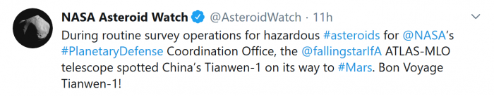 据外媒报道, Asteroid Terrestrial-impact Last Alert System(简称Atlas)有一项重要的工作要做,那就是寻找可能对地球构成威胁的“城镇杀手”、“城市杀手”和“乡村杀手”小行星。但有时它看到的不仅仅是太空岩石。该太空望远镜碰巧看到了中国刚刚发射的“天问一号”火星探测器。