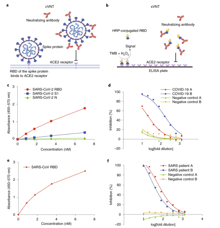 该公司在《自然》杂志上发表了一项研究,解释了该检测的工作原理。该检测方法被称为cPass,用于新加坡和中国的两组患者,分别检测375名和250名受试者。该研究比较了传统的基于细胞和病毒的检测试验(cVNT)和新的代用病毒中和试验(sVNT),发现后者(cPass试验)检测患者的中和抗体的灵敏度为95%-100%,特异性为99.93%。