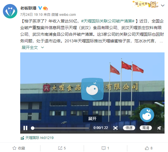 “健康美丽喝啥哟,天喔蜂蜜柚子茶”,相信这句广告词很多小伙伴都非常熟悉。天喔蜂蜜柚子茶作为范冰冰、周冬雨代言的一款饮料,在之前十分火爆。近日,全国企业破产重整案件信息网显示天喔(武汉)食品有限公司、武汉天喔茶庄饮料有限公司、武汉市南浦食品公司合并破产清算。