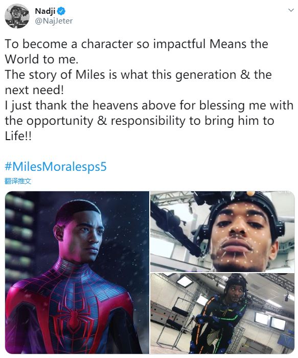 在PS5游戏《漫威蜘蛛侠:迈尔斯·莫拉莱斯》中饰演主角的 NajJeter 今日(7月25日)发布了一条推特,对自己获得出演的机会表达了感谢,同时附上了两张动捕照片。“能够饰演一名如此具有影响力的角色,对我而言意味着很多。