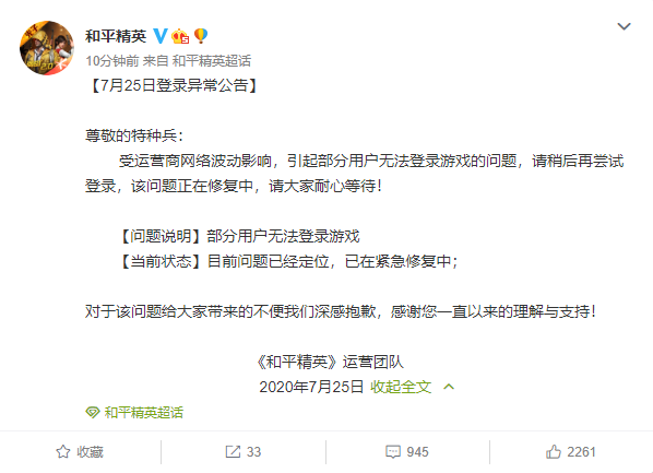 7月25日中午,腾讯手游《和平精英》突然出现大范围故障,部分用户无法登录游戏。对此,官方回应称:目前问题已经定位,已在紧急修复中。官方公告写道“受运营商网络波动影响,引起部分用户无法登录游戏的问题,请稍后再尝试登录,该问题正在修复中,请大家耐心等待!”