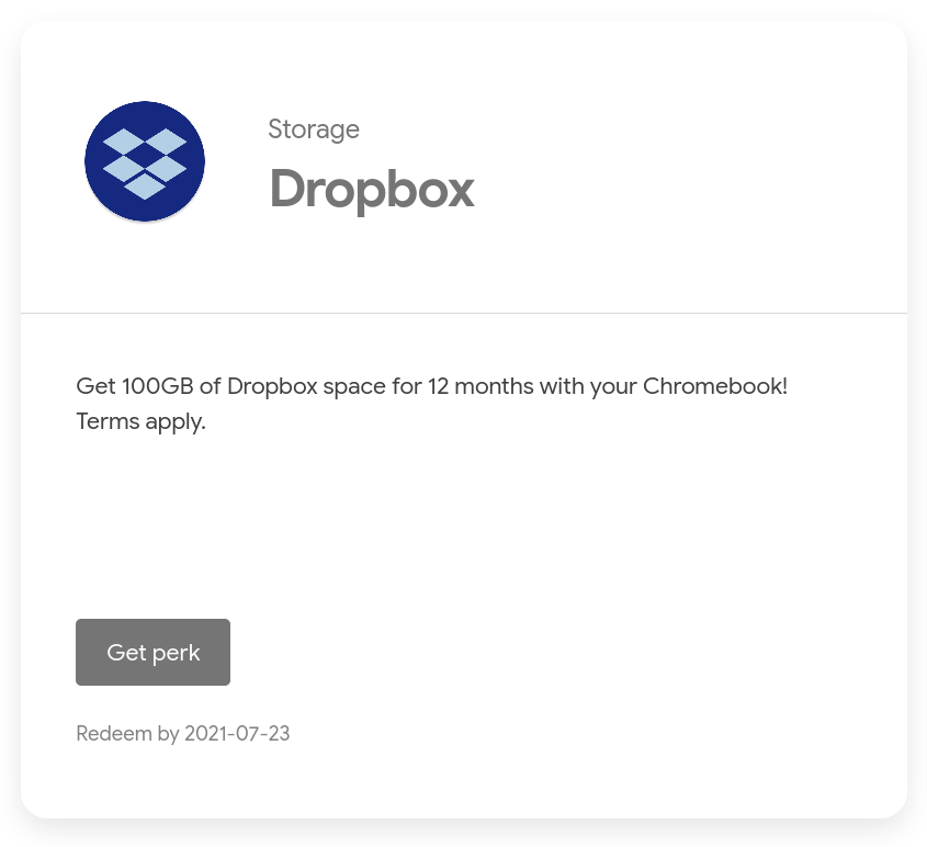 需要注意的是,Chromebook的优惠活动通常只在选定的地区有效,并且可能无法在所有型号上工作。要试一下是否可以,请访问这个链接,并点击Dropbox选项上的 "获得福利"按钮。