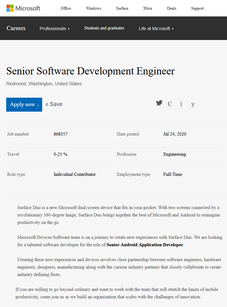 微软也会如此,根据一个新的工作岗位需求, 微软新款移动设备Surface Duo发布在即,公司将为这款寄予厚望的手机开发专用的官方捆绑Android应用,以展示Surface Duo的双屏体验,并为这款手机制定了详细的软件发布路线图和计划。