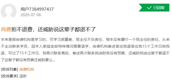 尚德机构一学员李阳就遇到了上边提到的这些问题,他于 6 月 27 日在黑猫投诉平台投诉尚德退款难问题。对此,新浪科技于 7 月 24 日采访了尚德机构相关负责人(该负责人要求匿名)。该负责人在经过内部调查核实后对新浪科技回复称,该学员曾于 2019 年 11 月 27 日后多次提出退费,但因并未满足考试分数在 40-60 分且单科直播出勤率 50% 以上的退款协议,故而尚德方面未予退款;但学员曾同意转课。该学员于 2020 年 6 月 10 日因安排有变再次申请退款,尚德方面以报名时间超过一年不符合退费条件为由,拒绝退款,但提出冻结课程或转课的方案。