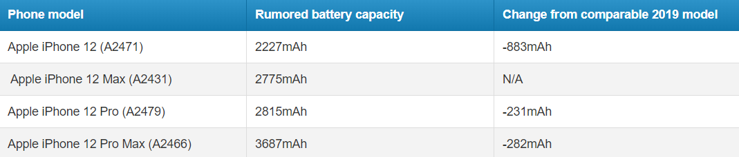 iPhone 12(A2471)2227mAh、iPhone 12 Max(A2431)2775mAh、iPhone 12 Pro(A2479)2815mAh、iPhone 12 Pro Max(A2466)3687mAh。