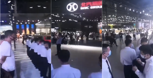 品牌方见状,迅速关灯处理,同时在场的品牌方车展工作人员,还迅速集结在一块,组成了一道人墙,甚至还一度拉起了黑布阻挡。
