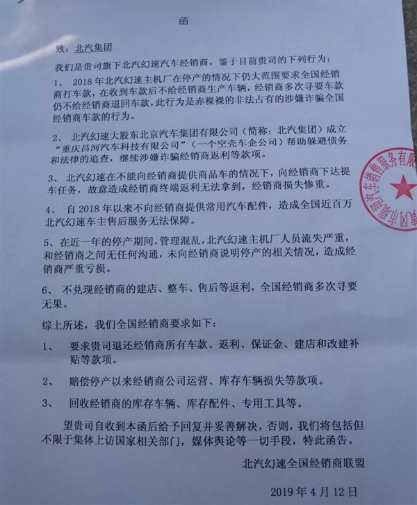 由于工厂停产,经销商也无车可卖。但此前经销商已经预付了购车款,但北汽幻速方面没有及时退款。在2019年4月份,多家经销商前往北汽集团总部维权,讨回数亿元购车预付款。