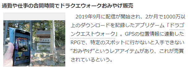 ·运用自己上班或工作间隙卖些《勇者斗恶龙WALK》的特产。类似《勇者斗恶龙 WALK》这种和GPS联动的地域性游戏,玩家可以利用自己的独特位置收获特别的业余收入。