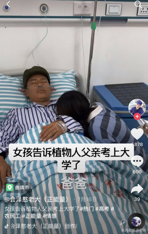 在另一段视频中,女孩扎着两个辫子头发凌乱,坐在病床前,用力摇晃着病床上的父亲,嘴里喊着“爸爸,你快醒过来,我考上清华大学了,我好想你,我好想你”,可是植物人父亲却始终没有睁开眼睛;