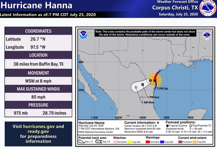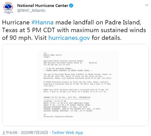 外媒报道称,周六的时候,大西洋上生成的热带风暴汉娜(Hanna)升级成为了 1 级飓风,并于当天下午在美国德克萨斯州科珀斯·克里斯蒂市(Corpus Cristi)南部的帕德里岛(Padre Island)登陆。美国国家飓风中心(NHC)预估的大雨和风暴速度达到了 110 英里 / 小时(177 公里 / 小时),并且发出了可能造成重大破坏的警告。