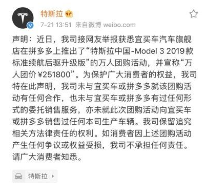 随后,特斯拉官方出来“打假”:没有与拼多多有任何合作,后续出现问题也不承担相关责任。