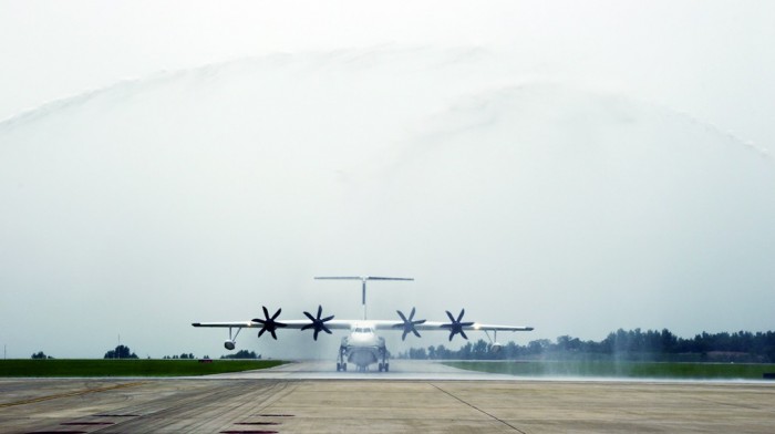 完成海上首飞后,“鲲龙”通过气势恢宏的水门接受检阅