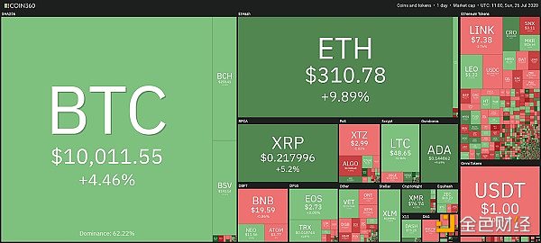 当比特币价格开始上涨时,主要的山寨币以及表现良好的DeFi代币却开始暴跌,比如以太坊(ETH)从322美元跌至311美元,而且包括Aave和YFI在内的许多DeFi代币价格也在走低。下图是7月26日的加密货币市场表现,资料来源:Coin360: