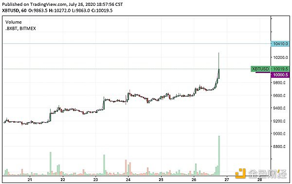 比特币的价格突然飙升至10200美元,为什么呢?有人认为可能与价值7500万美元的比特币空头合约被清算有关。7月26日周日,比特币市场忽然出现意外反弹,价格一度飙升到了10,272美元,仅在BitMEX上就清算了价值7400万美元的比特币多头合约,也让许多交易者感到措手不及。