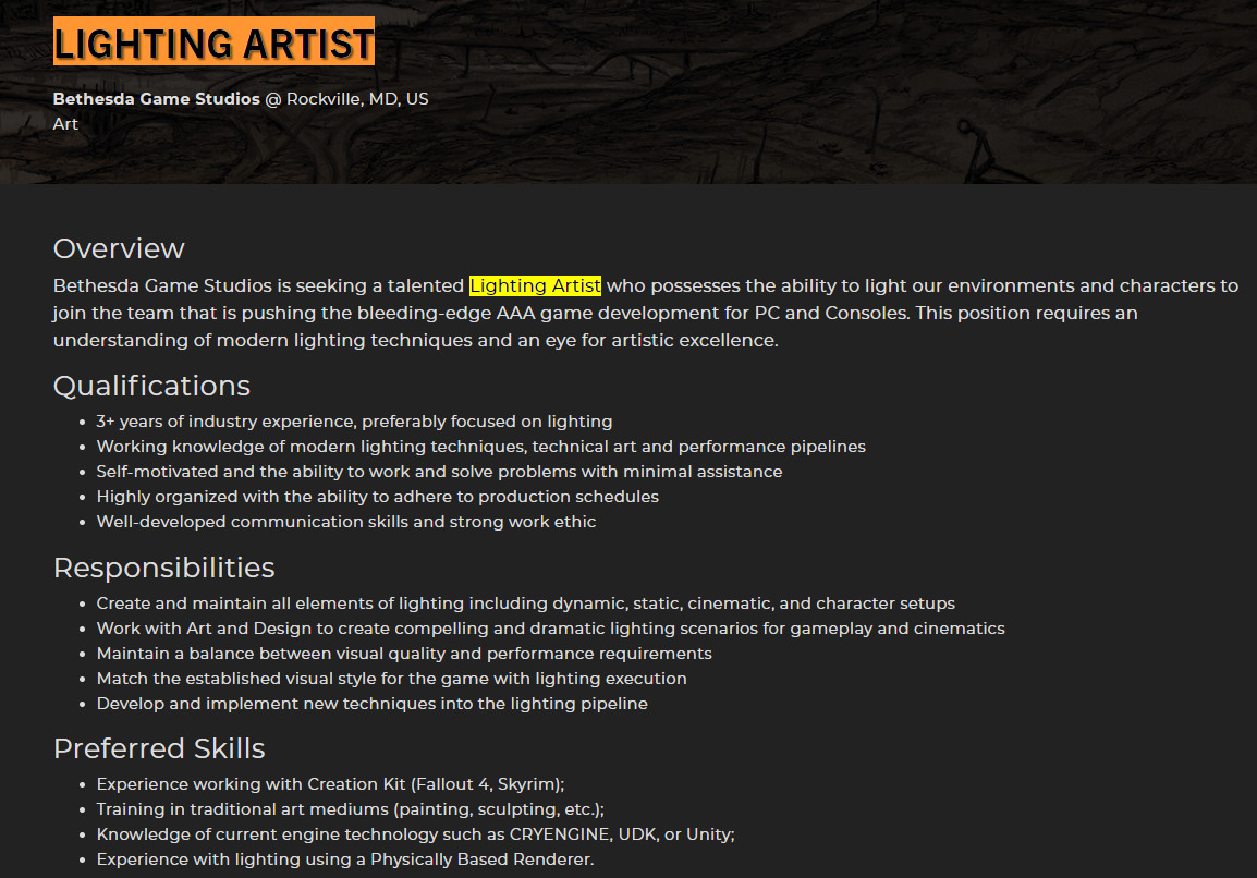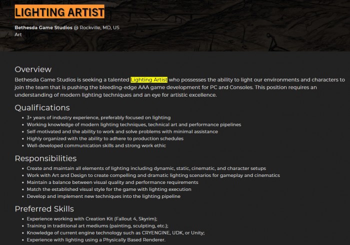 B社当前有两个3A级大型RPG游戏——《星空》和《上古卷轴6》在开发。最近B社母公司ZeniMax在官网上公开了一个“光照美工(Lighting Artist)”的招聘广告,看起来,B社仍在为新作招募高级开发人员,这两个新作距离发售还要一段时间,尤其是后者。