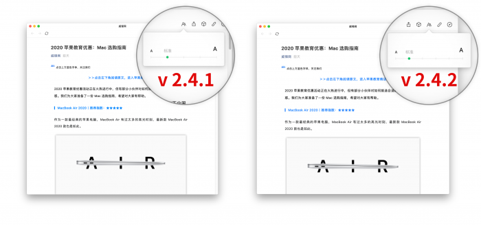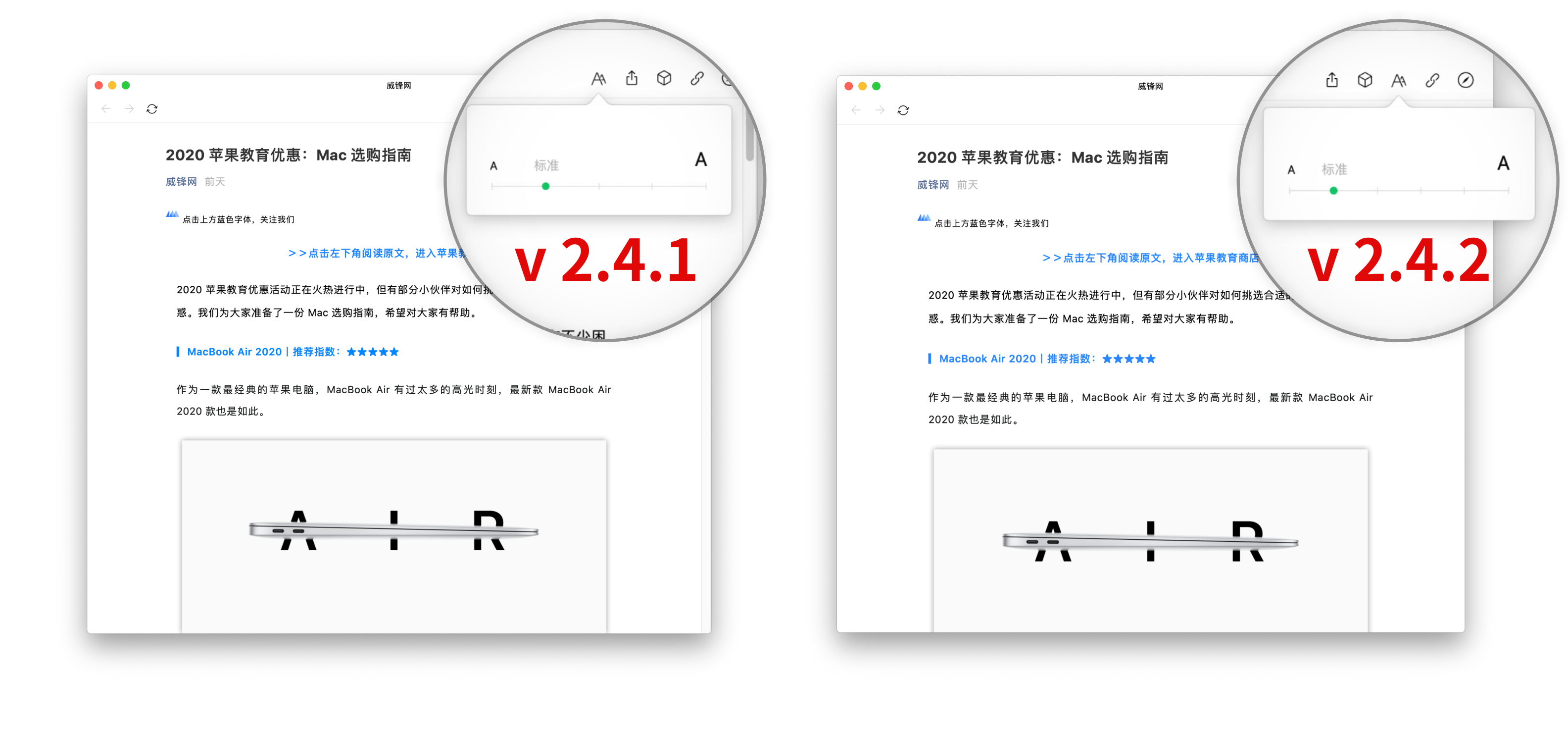 微信 2.4.2 for Mac 还优化了浏览网页时调整字号的体验,文字大小的可调档位由之前的五档增多到了六档,拥有更加平滑的字体大小调整体验。