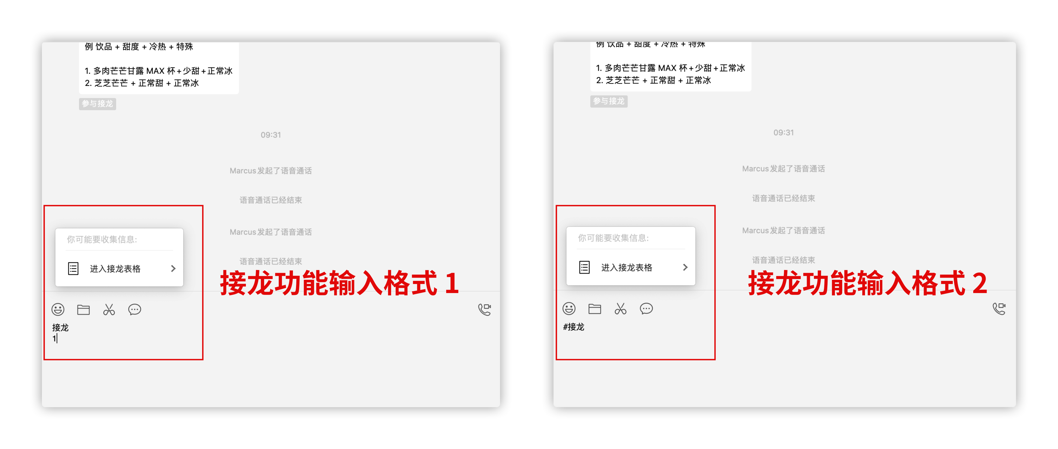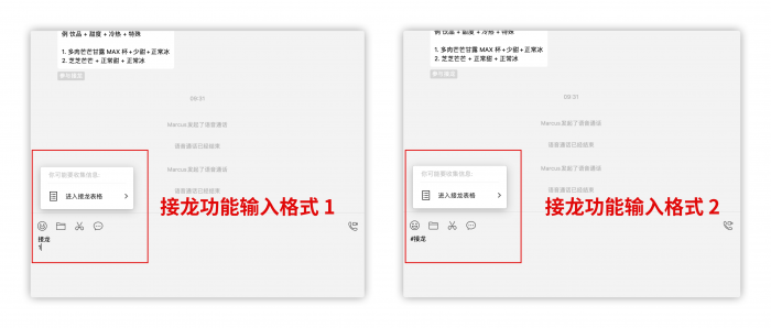群内的任何人都可以发起“接龙”,但不同于引用、撤回等功能,接龙没有具体可视入口,只能通过在聊天框中输入“#接龙”或“#接龙 + 换行 + 数字”的形式激活,具体格式如下: