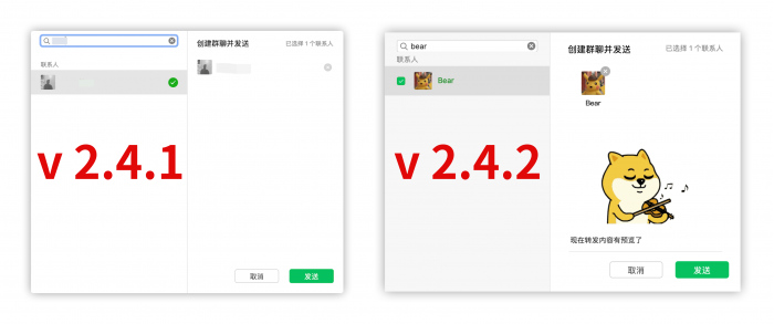 微信 2.4.2 for Mac 还进一步优化了转发消息的界面和体验,现在给好友转发消息时可以在转发框中预览消息内容和查看好友详情,减少了误转发的几率。