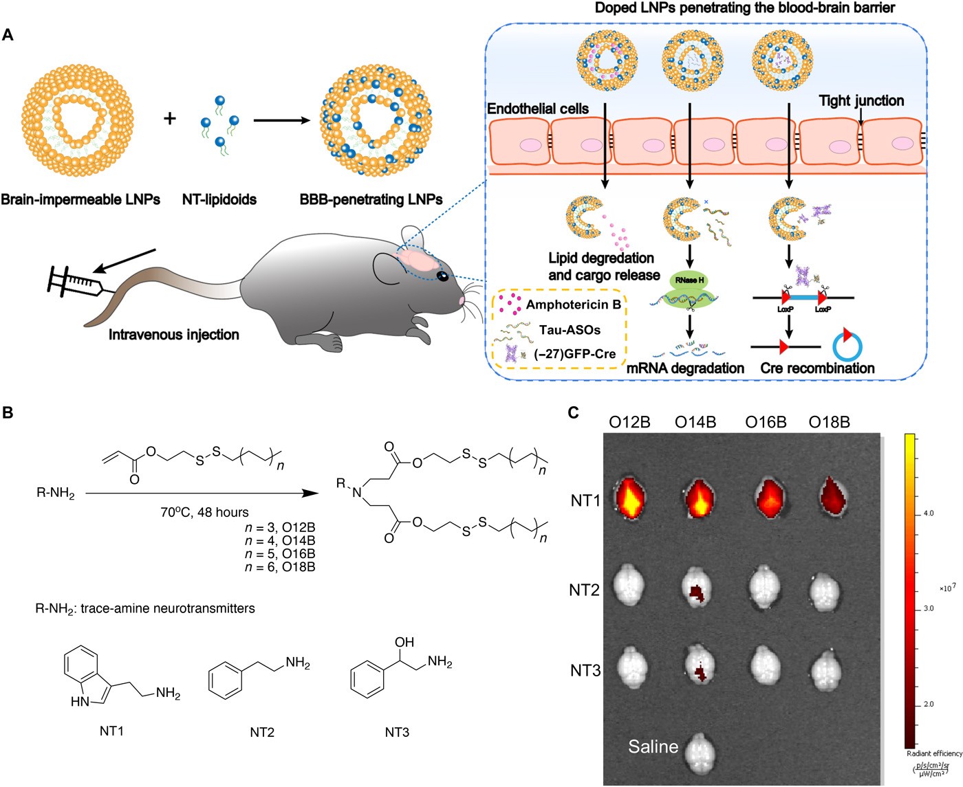 然后,这些所谓的NT-脂质类化合物可以和药物一起被装入微小的纳米粒子气泡中,并进行静脉注射。神经递质有助于引导颗粒穿过血脑屏障,然后与大脑中的细胞融合并释放其有效载荷。