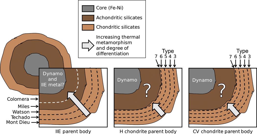 还有IIE陨石。这些怪异的中间地带天体似乎同时是两种类型,由曾经熔化的金属与岩石包裹体组成。自20世纪60年代以来,科学家已经发现了20多颗这样的陨石,它们被发现来自一颗拥有液态金属核的小行星,外层被岩石包裹。