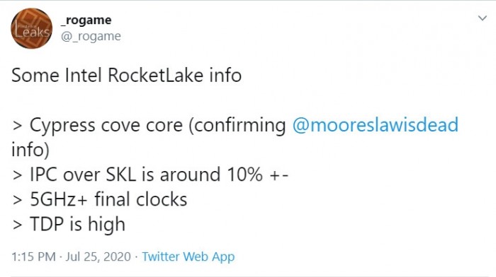 和10代酷睿家族类似,11代酷睿上,Intel也是延续两套制程方案,移动平台有基于10nm的Tiger Lake,桌面平台则主打14nm的Rocket Lake。Intel已经确认,Rocket Lake的CPU架构代号Cypress cove。据爆料人rogame透露,相较于Skylake,Cypress cove IPC(每时钟周期指令集、可等价同频性能)的提升在10%左右。