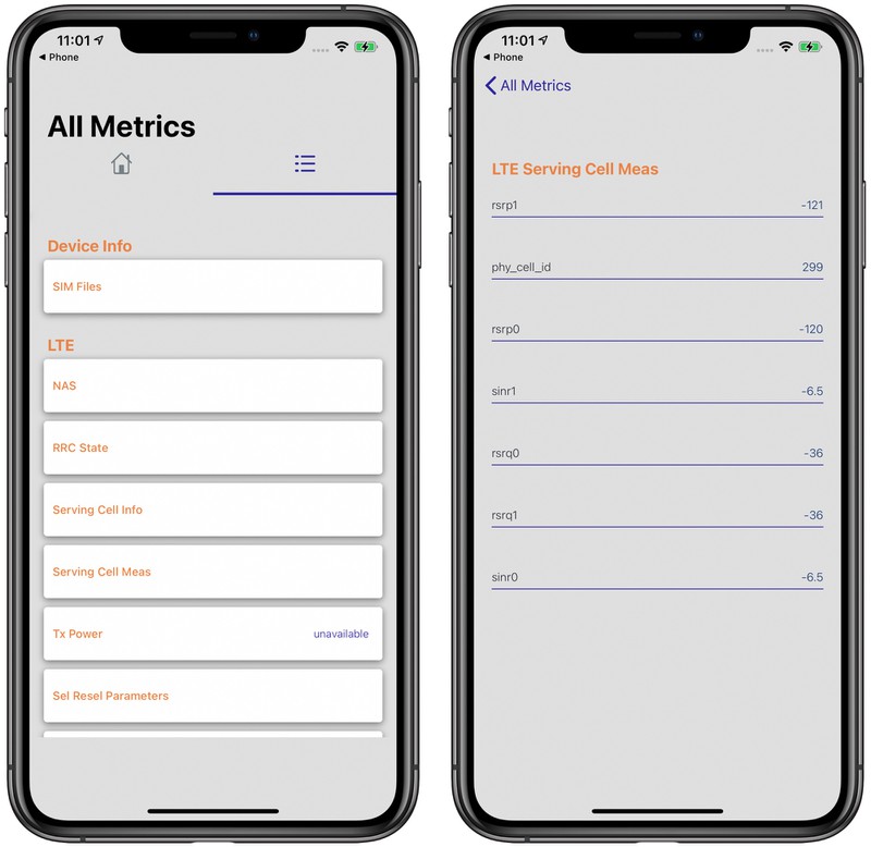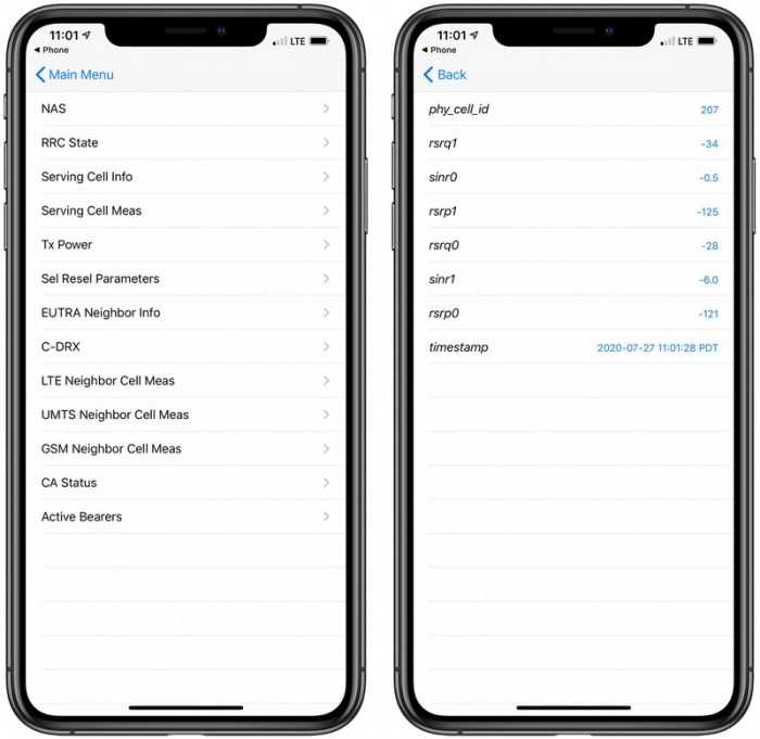 打开电话 app,输入 *3001#12345#* ,随后按拨号键,就可以进入场测模式。下面是 iOS 13 场测模式。