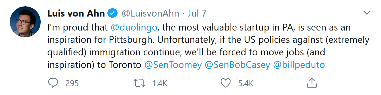 Duolingo CEO兼联合创始人Luis von Ahn本人也是来自危地马拉的移民,他表示,特朗普政府的政策将阻碍其发掘和聘用人才的能力。Von Ahn本月早些时候在Twitter发文称:“如果美国继续对(极有资格的)移民采取(这种)政策,那么我们将被迫把岗位(和灵感)转移到多伦多。”