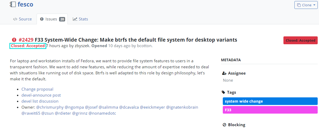 Fedora 33 内核已经加入了多个 Btrfs 内核补丁,相关 PR 已提交到上游的 linux-btrfs@,包括新的